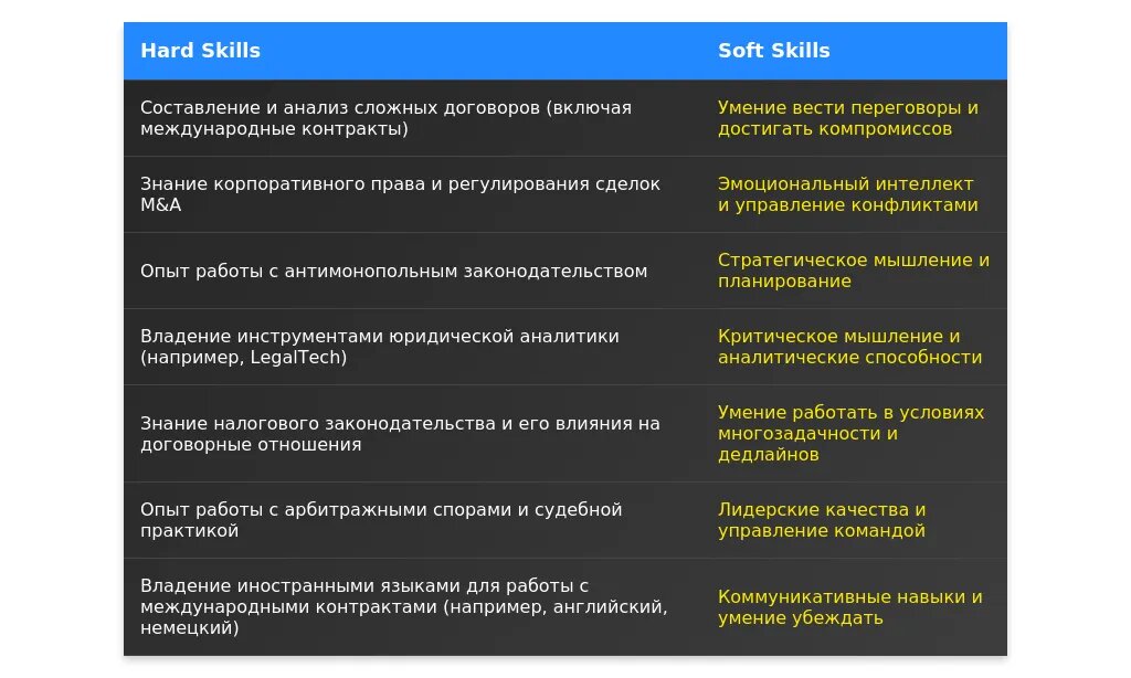 - Баланс между широтой и глубиной: "Эксперт в договорной работе, знание смежных областей (налоговое право)."