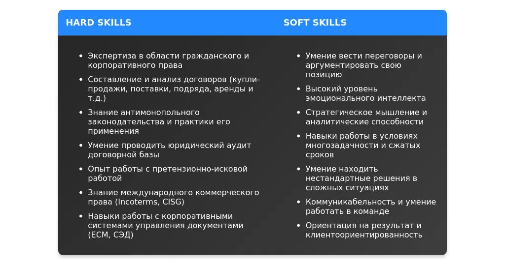 До: "Работа с договорами, знание законодательства, переговоры."