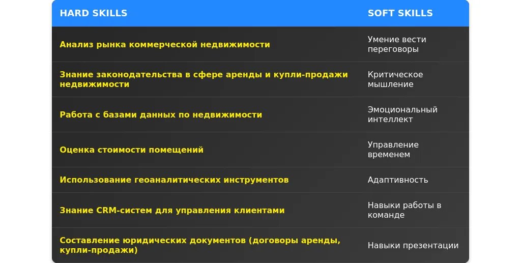 ✅ 1. Коммуникабельность: успешно взаимодействую с клиентами и арендодателями. 2. Клиентоориентированность: подбираю помещения с учетом всех пожеланий клиента. 3. Навыки ведения переговоров: снизил стоимость аренды на 10-15% для 5 клиентов. 4. Стрессоустойчивость: эффективно работаю в условиях многозадачности. 5. Внимание к деталям: учитываю все нюансы при подготовке договоров аренды.