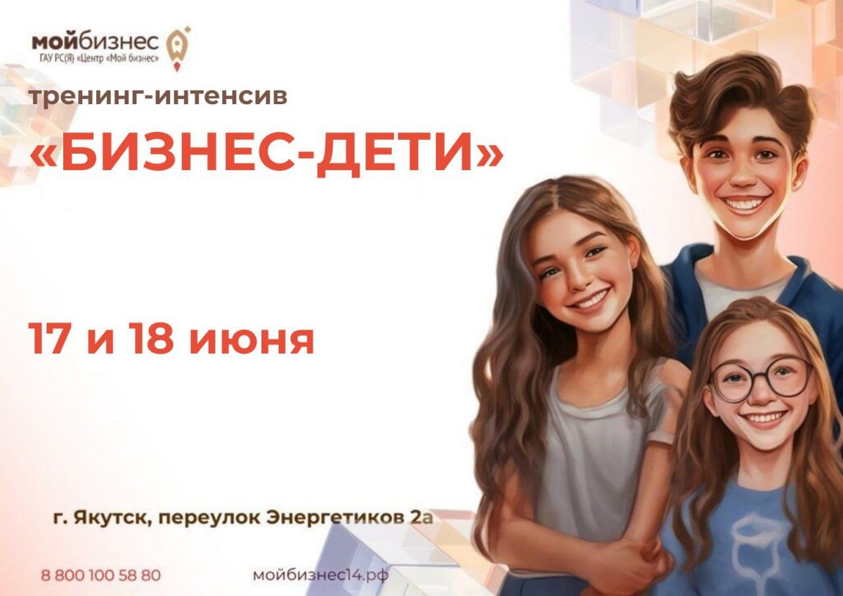Центр «Мой бизнес» 17 и 18 июня приглашает к участию подростков с 14-ти лет на двухдневный бесплатный интенсив «Бизнес-дети»️ Участников ждут два дня интерактивных занятий, которые помогут развить предпринимательские способности, освоить метод создания перспективных бизнес-идей, прокачать ораторские навыки, обрести новых друзей. Программа семинара включает тренинги и мастер-классы, бизнес-визиты к предпринимателям, творческие мероприятия и занимательные игры. И, конечно же, юных участников ждут новые знакомства и друзья из разных уголков республики. При успешном прохождении образовательной программы всем участникам выдается сертификат. Место проведения: г. Якутск, пер. Энергетиков, 2а. Дата: 17 и 18 июня 2025 года Время проведения: с 10:00-17:00 чч. Ссылка для регистрации: https://forms.yandex.ru/cloud/683408684936396fe7f72201/ На все возникающие вопросы вам ответят: по номеру бесплатной горячей линии 8-800-100-58-80