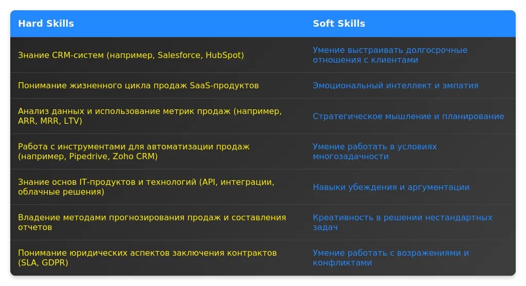 Hard skills — это профессиональные навыки, которые можно измерить и подтвердить. Для менеджера по продажам ПО они особенно важны, так как требуют понимания специфики продукта.