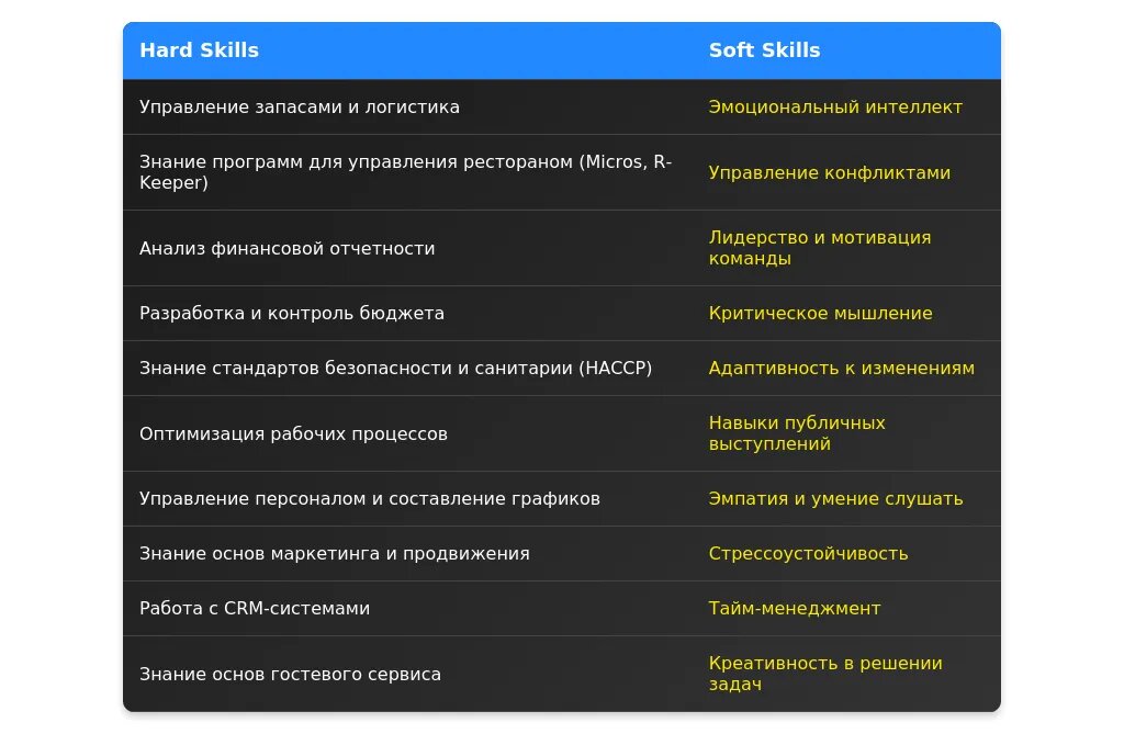 Пример 1: В вакансии указано: "Опыт работы от 3 лет в ресторанном бизнесе, знание стандартов обслуживания, навыки управления персоналом до 20 человек". Здесь обязательные требования — опыт и навыки управления, а знание стандартов — ключевой показатель.