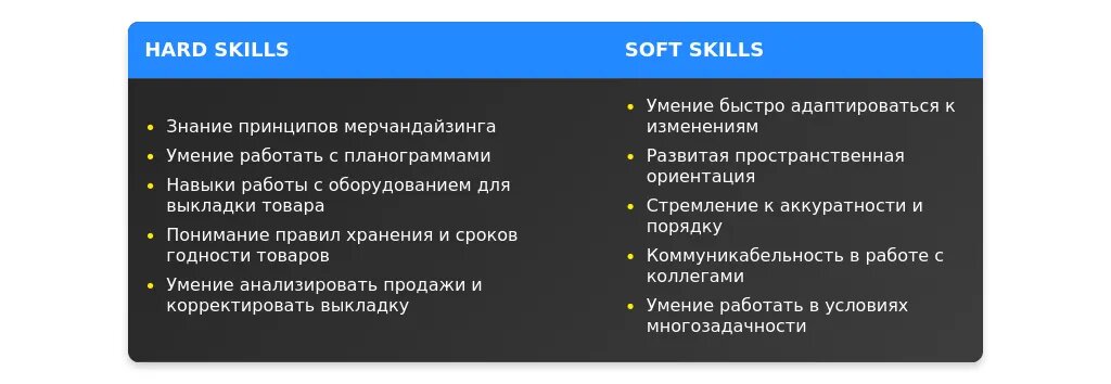 - Актуальные требования работодателей и список ключевых навыков для сотрудника на выкладку товара.