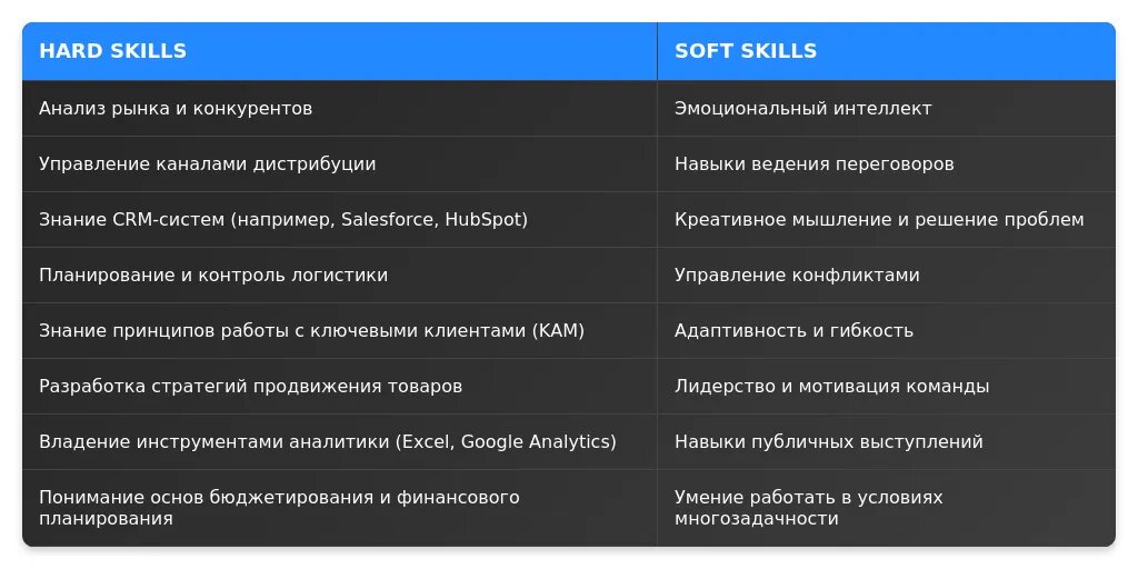 Навыки необходимо перегруппировать под требования вакансии. Например, если вакансия требует знания CRM-систем, укажите конкретные системы, с которыми вы работали. Выделите требуемые компетенции, такие как управление командой или ведение переговоров.