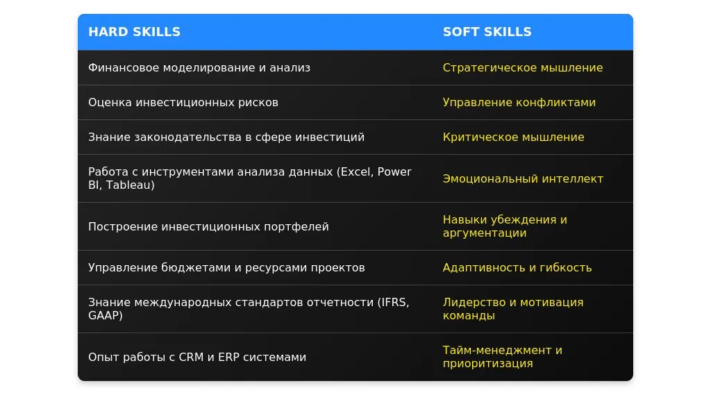 Ключевые фразы: "управление бюджетами", "привлечение инвестиций", "анализ рисков", "оптимизация процессов".
