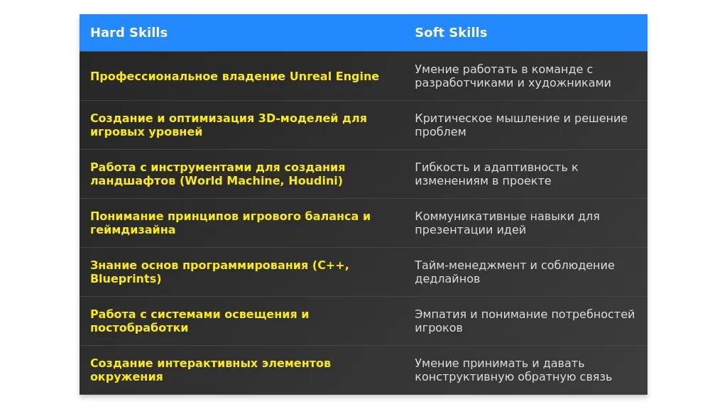 - Сделайте акцент на базовых навыках (например, знание Unreal Engine, Blender).