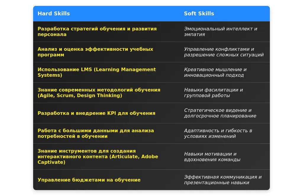 - Ключевые навыки (например, управление проектами, анализ потребностей в обучении).