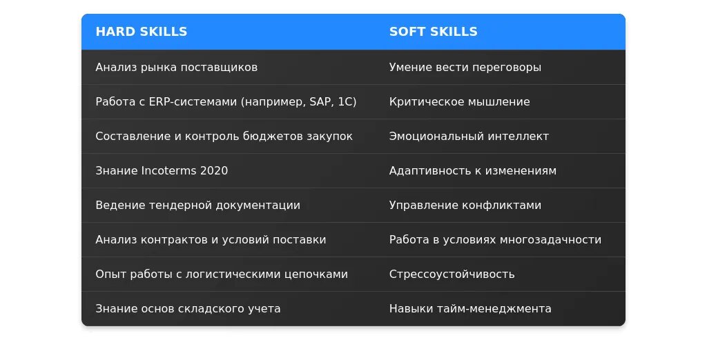После адаптации: "Опыт работы с ERP-системами, ведение отчетности по закупкам, проведение переговоров с поставщиками, знание английского языка на уровне Upper-Intermediate."
