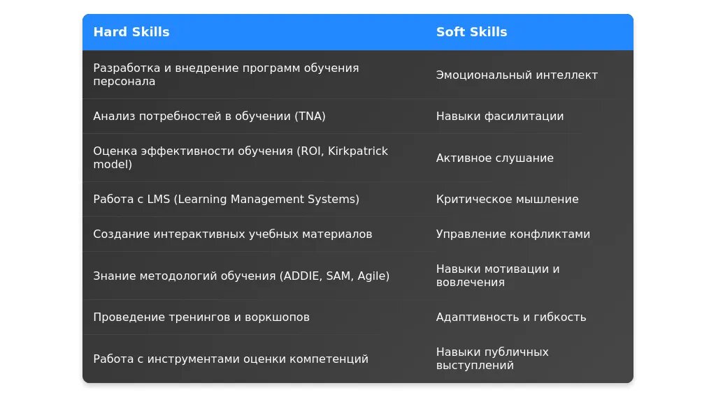После: Проведение тренингов, разработка обучающих программ, знание методик обучения (blended learning, gamification).
