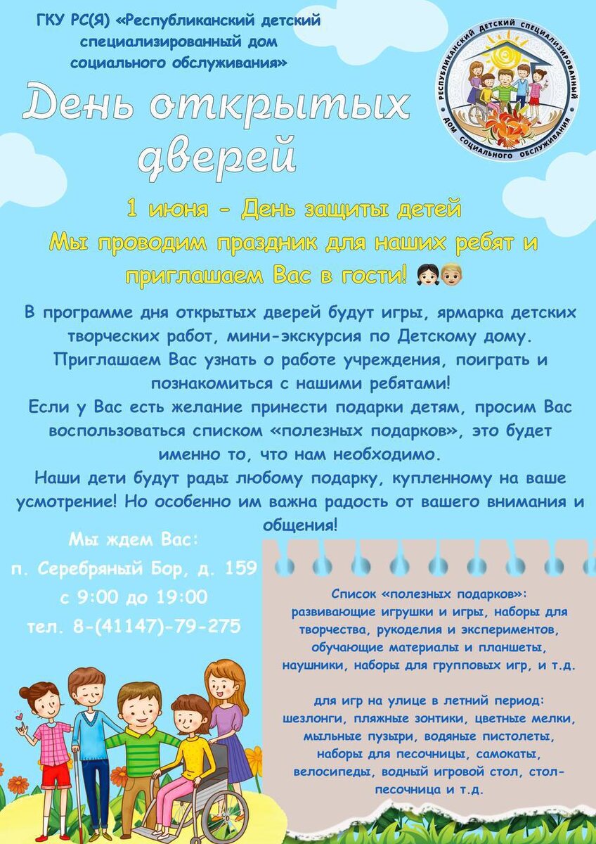 Уважаемые жители Нерюнгринского района! Дорогие друзья! 🤗 Мы рады сообщить, что 01 июня с 9:00 до 19:00 часов в нашем учреждении будет проходить День открытых дверей, приуроченный к Международному дню защиты детей. Это мероприятие очень значимо для нас - возможно Вы сможете подружиться с кем-то из наших ребят и станете приезжать в гости по-чаще, чтобы проводить время с детьми. Хочется сделать акцент - этот день не ради подарков, этот день для детей 👦🏼❤👧🏼 Приходите познакомиться с нашими ребятами, посмотреть наш быт изнутри. Будем рады видеть Вас среди наших гостей! ☺