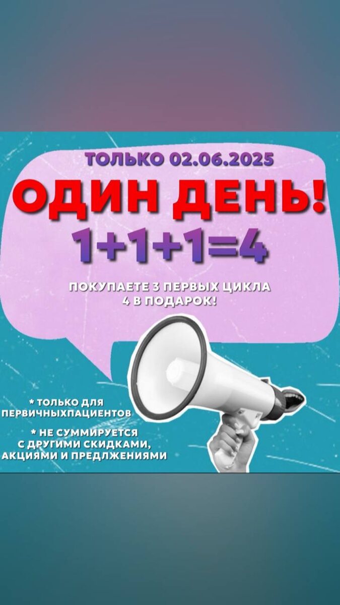 🎁 Акция! 3 цикла покупаешь — 4-й в подарок! 🎉 *Только 02.06.2025* *Только для первичных пациентов* Порадуйте себя выгодной покупкой! Только сейчас: при покупке первого, второго и третьего циклов Вы получаете **4-й абсолютно бесплатно! 💥 Отличная возможность сэкономить и получить больше пользы! 📅 Успейте воспользоваться — предложение действует *один* день! #акция #выгода #спецпредложение #подарок #скидки ☎️ 8-4234-38-40-51