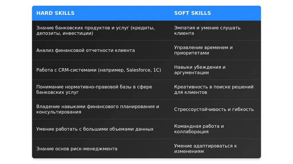 - Знание продуктов банка: кредиты, депозиты, инвестиции.