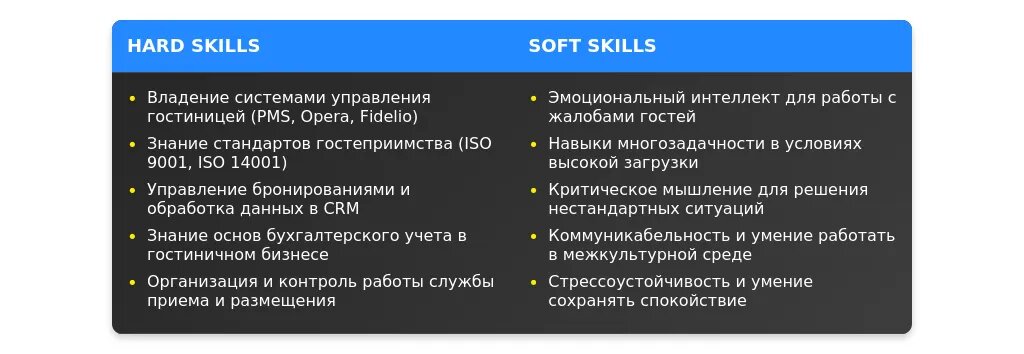 Навыки необходимо перегруппировать, чтобы выделить те, которые соответствуют требованиям вакансии. Например, если требуется знание системы Opera, стоит поставить этот навык на первое место. Используйте ключевые слова из описания вакансии, чтобы резюме прошло автоматический отбор.