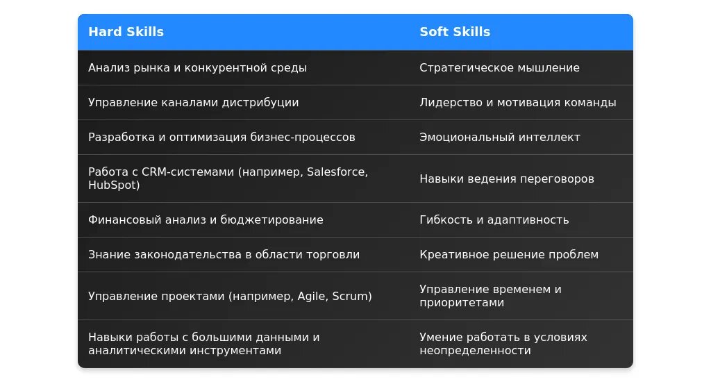 После адаптации: "Управление дистрибьюторскими сетями, работа с CRM-системами, аналитика рынка, навыки переговоров."