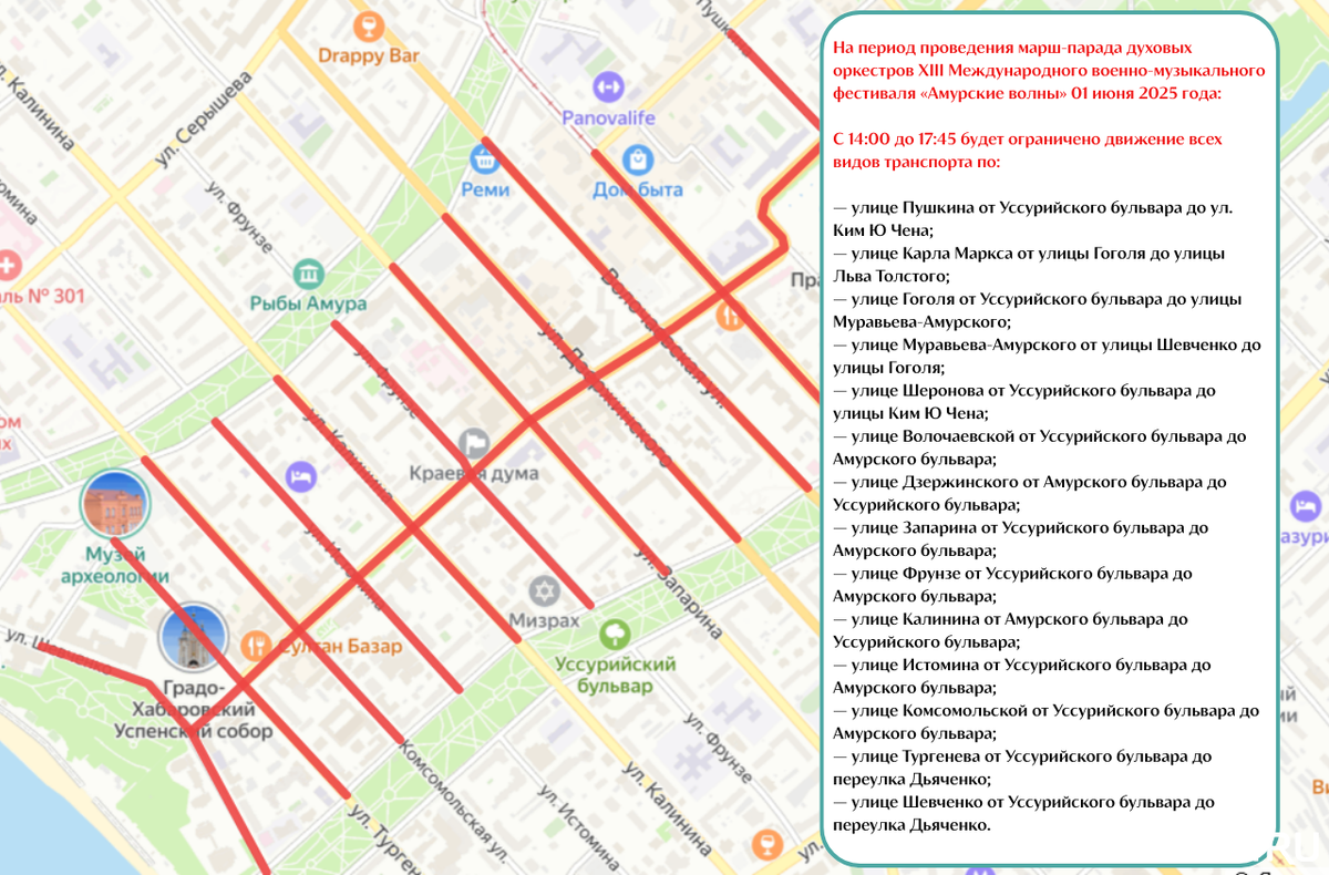 На период проведения марш-парада духовых оркестров XIII Международного военно-музыкального фестиваля «Амурские волны» 1 июня: с 14:00 до 17:45 будет ограничено движение всех видов транспорта по: — улице Пушкина от Уссурийского бульвара до улицы Ким Ю Чена;— улице Карла Маркса от улицы Гоголя до улицы Льва Толстого;— улице Гоголя от Уссурийского бульвара до улицы Муравьева-Амурского;— улице Муравьева-Амурского от улицы Шевченко до улицы Гоголя;— улице Шеронова от Уссурийского бульвара до улицы Ким Ю Чена;— улице Волочаевской от Уссурийского бульвара до Амурского бульвара;— улице Дзержинского от Амурского бульвара до Уссурийского бульвара;— улице Запарина от Уссурийского бульвара до Амурского бульвара;— улице Фрунзе от Уссурийского бульвара до Амурского бульвара;— улице Калинина от Амурского бульвара до Уссурийского бульвара;— улице Истомина от Уссурийского бульвара до Амурского бульвара;— улице Комсомольской от Уссурийского бульвара до Амурского бульвара;— улице Тургенева от Уссурийског