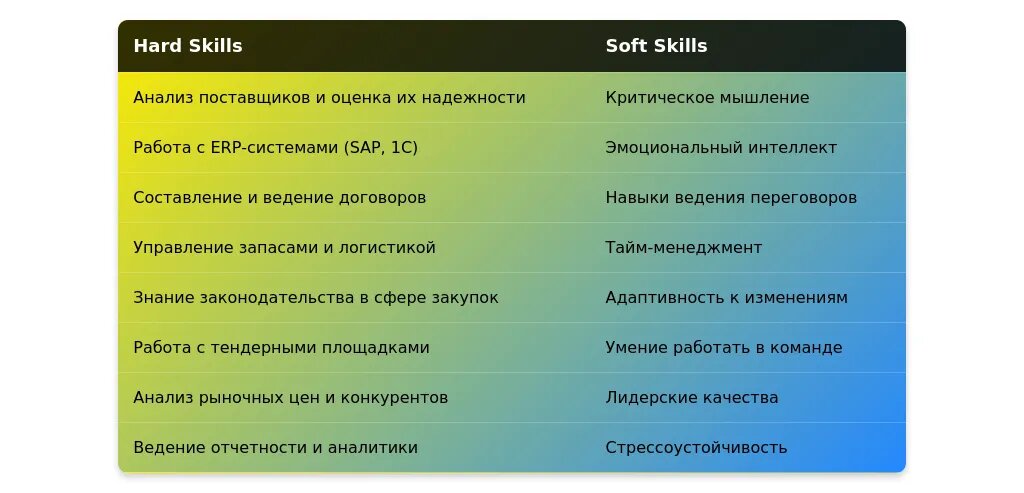 Акцент на: аналитические способности, внимание к деталям, коммуникативные навыки, базовые знания в закупках.