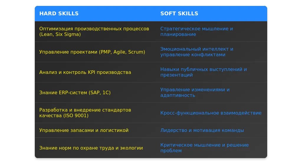 - Топ-10 soft skills: Лидерство, стратегическое мышление, коммуникация, умение принимать решения, стрессоустойчивость, управление конфликтами, адаптивность, организаторские способности, критическое мышление, эмоциональный интеллект.