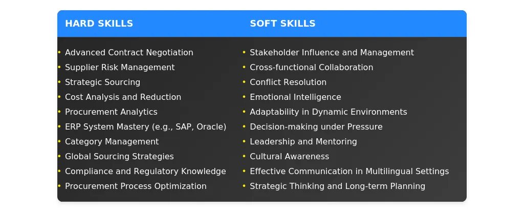 После: Навыки: стратегические закупки, управление контрактами, оптимизация цепочек поставок.