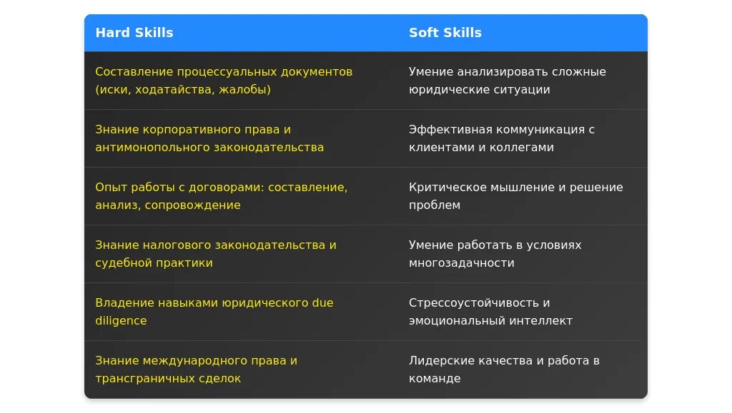 Добавляйте как общие навыки (например, "составление договоров"), так и узкие ("юридическое сопровождение M&A").