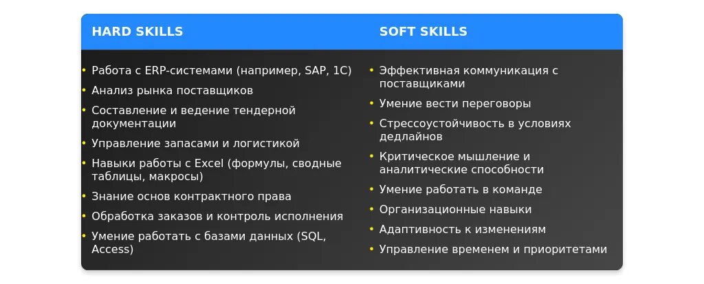 - Ключевые навыки (например, работа с Excel, анализ поставщиков, ведение переговоров).