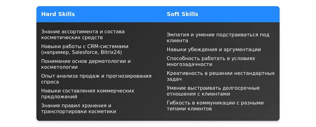 Перегруппируйте навыки в соответствии с требованиями вакансии. Например, если работодатель ищет кандидата с опытом работы с CRM, поставьте этот навык на первое место. Используйте ключевые слова из описания вакансии, такие как "работа с клиентами", "управление продажами" или "знание косметического рынка".