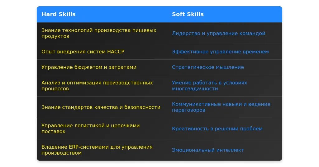 Перегруппируйте навыки, чтобы на первом месте были те, которые соответствуют вакансии. Например, если в вакансии требуется знание HACCP и опыт работы с ERP-системами, поставьте их на первое место.