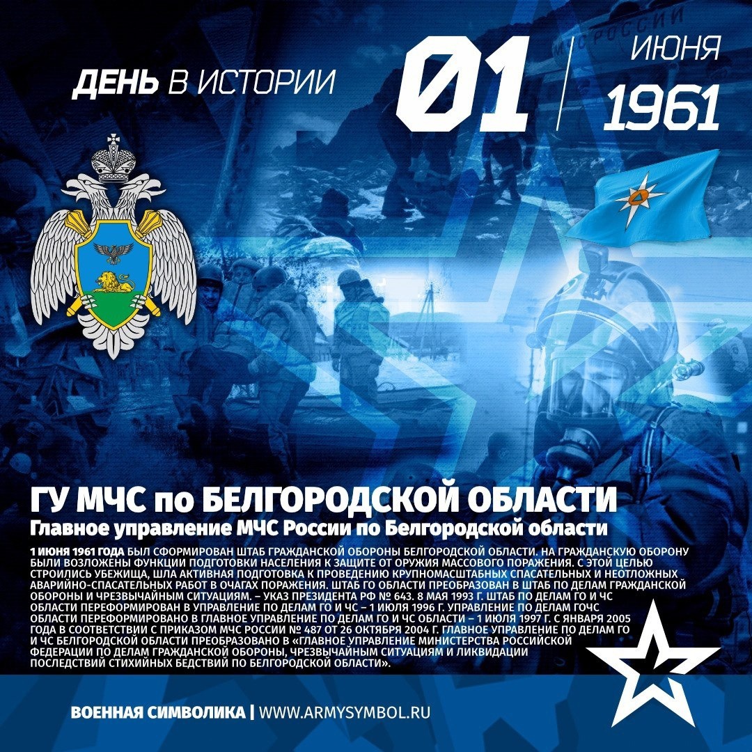 ГУ МЧС по Белгородской области с 1961 Главное управление МЧС России по Белгородской области Белгородская область была образована 6 января 1954 года. В ее состав вошли 23 района Курской и 8 районов Воронежской областей, общей площадью 27,1 тыс. кв. км. С первых дней образования в области начинает формироваться система МПВО (местная противовоздушная оборона). Создаются областные службы МПВО на базе управлений облисполкома. 1 июня 1961 года был сформирован Штаб гражданской обороны Белгородской области. На Гражданскую оборону были возложены функции подготовки населения к защите от оружия массового поражения. С этой целью строились убежища, шла активная подготовка к проведению крупномасштабных спасательных и неотложных аварийно-спасательных работ в очагах поражения. В 1971 году руководство системой ГО было передано Министерству обороны СССР. Штаб ГО области преобразован в штаб по дела Показать полностью... Подпишитесь на наши группы ВКонтакте и в Одноклассниках - читайте, смотрите и к