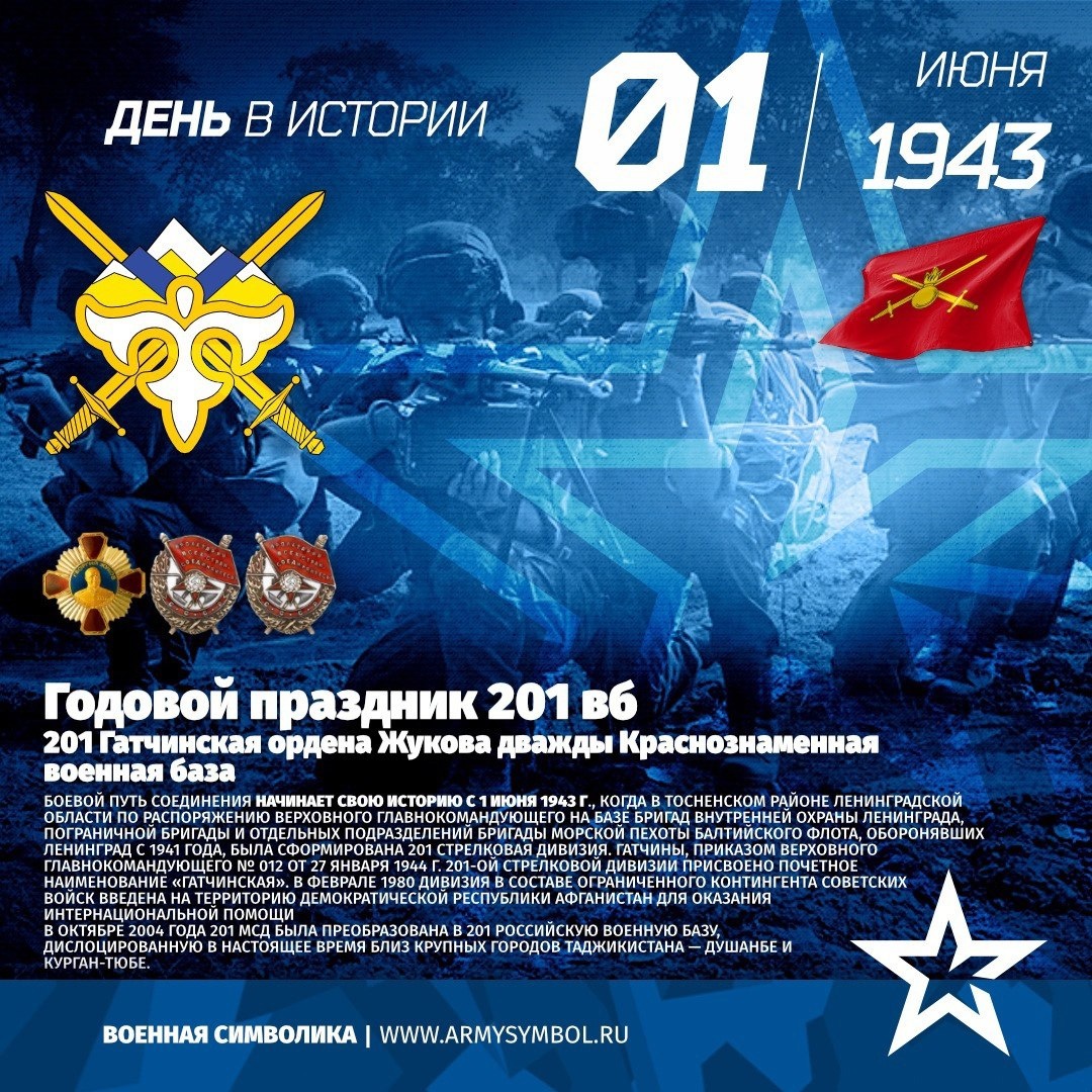 Годовой праздник 201 вб с 1943 201 Гатчинская ордена Жукова дважды Краснознаменная военная база Боевой путь соединения начинает свою историю с 1 июня 1943 г., когда в Тосненском районе Ленинградской области по распоряжению Верховного Главнокомандующего на базе бригад внутренней охраны Ленинграда, пограничной бригады и отдельных подразделений бригады морской пехоты Балтийского флота, оборонявших Ленинград с 1941 года, была сформирована 201 стрелковая дивизия. Боевое крещение дивизия приняла в 1944 г. в боях за освобождение Гатчины. В составе войск Ленинградского фронта воинские части дивизии освободили более 55 населенных пунктов и овладели городом Гатчина. За мужество и массовый героизм, проявленный при освобождении Гатчины, приказом Верховного Главнокомандующего № 012 от 27 января 1944 г. 201 стрелковой дивизии присвоено почетное наименование «Гатчинская». Приказом Верховного Главно Показать полностью... Подпишитесь на наши группы ВКонтакте и в Одноклассниках - читайте, смотрите и