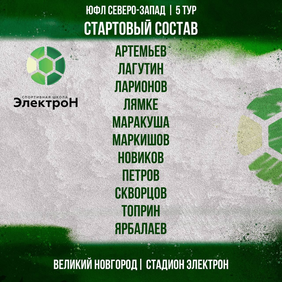 Вот стартовый состав команды СШ «Электрон» на матч с СШОР № 5 Калининград.