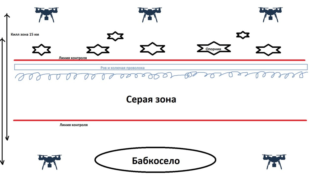 На первой схеме мы видим то, как в идеале должна выглядеть линия фронта с точки зрения ВСУ и к чему они, судя по всему, стремятся. Сверху позиции Украины. Есть сеть опорников, за ними на некотором расстоянии находятся позиции БЛАшников, а перед этим всем «киллзона» с инженерными заграждениями перед собственными позициями. Снизу позиции России: село, где накапливаются штурмовые отряды, а затем пытаются атаковать украинские позиции и там же отряды БЛАшников на таком же расстоянии. Между сторонами находится серая зона, которая никем не контролируется, так как стороны могут на ней концентрировать огонь. Для Украины это еще и киллзона, где всё что движется быстро уничтожается с помощью ударных БПЛА и артиллерии, которую они же наводят. Сама Украина находится в обороне и в киллзону просто не заходит. Там же находятся и инженерные заграждения, задача которых задержать противника в киллзоне, чтобы увеличить временное окно для нанесения ему огневого поражения. Усреднённую дальность полета F