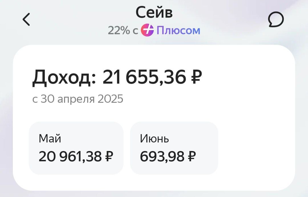 Рекорд по пассивному доходу с банковских инструментов. —————————————————— В мае открыл накопительный счет с "бонусной" ставкой в 22% в Яндекс Сейвы. Размещал все доступные средства, так как начисление процентов происходит ежедневно. Максимально удавалось получать около 700 ₽ в день. Странное ощущение, особенно вспоминаю, что в прошлом году за чуть большую сумму стоял контроллером на мероприятии, а именно работал. Тратил соответственно ресурсы, время, занимался активной деятельностью. Здесь же благодаря капиталу удается получать с него отклик в виде процентов. В мае 2025 года по накопительному счету вышло 20 961,38 ₽. Также пришли и проценты, набежавшие по накопительному счету в Т-Банк на 2887,98 ₽. Альфа вклад под ставку в 23,02% принес 2870,80 ₽. —————————————————— "Пассивный" доход за май 2025 года составил 26 720,16 ₽.
