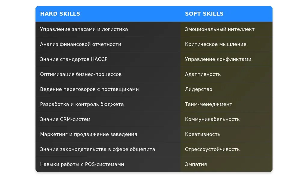 - Упомянуты ли ключевые навыки для менеджера кафе?