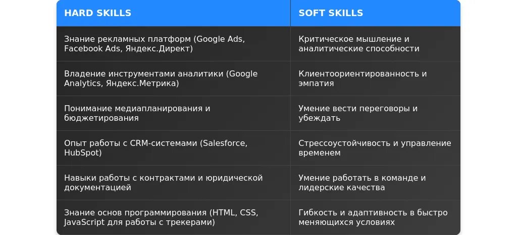 - Упомяните: Базовые навыки, такие как работа с Excel, Google Analytics, основы ведения переговоров.