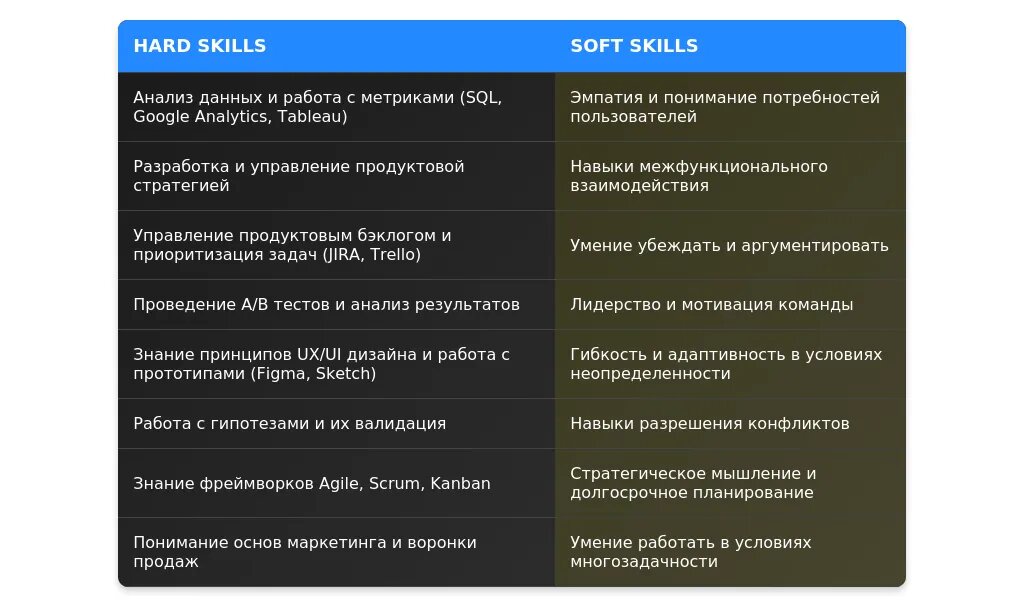 - Ключевые навыки (управление продуктом, аналитика, работа с командами).