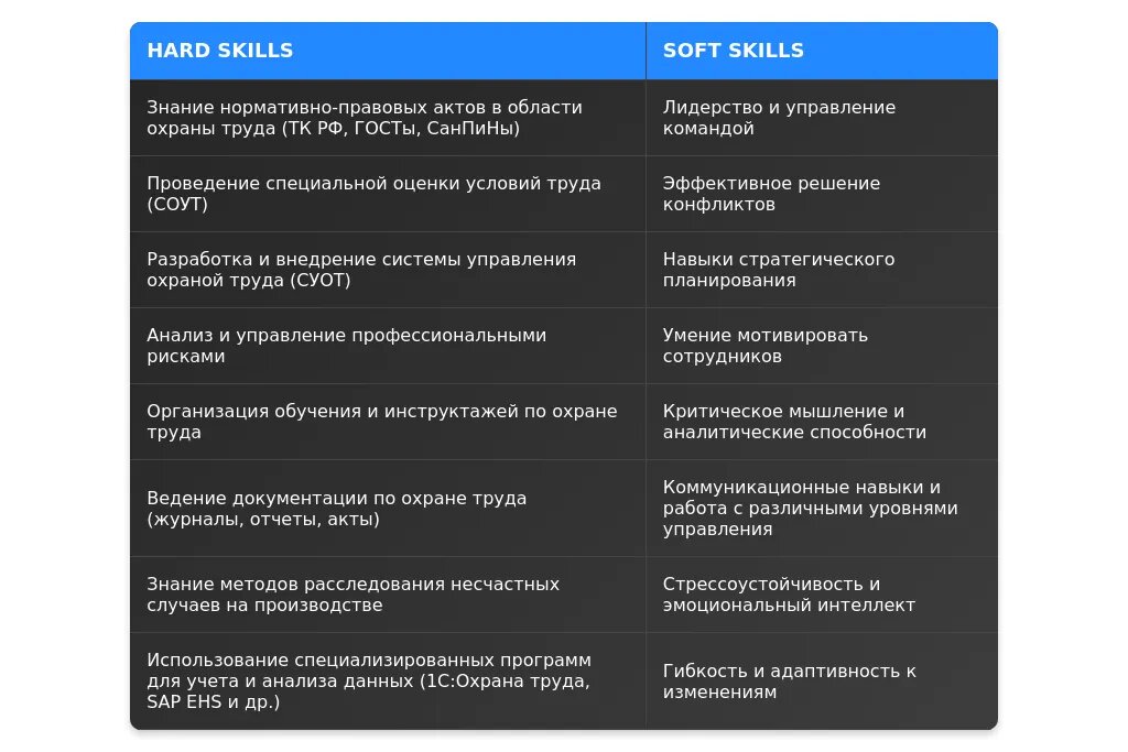 - Знание законодательства в области охраны труда (ТК РФ, ГОСТы, СанПиН).