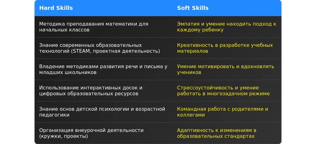 - Делайте акцент на базовых навыках, таких как "Разработка уроков", "Работа с детьми".