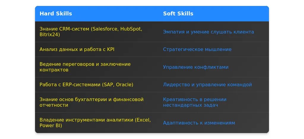 После адаптации: "Ведение корпоративных клиентов, работа с CRM-системами (Salesforce, Bitrix24), навыки ведения переговоров."