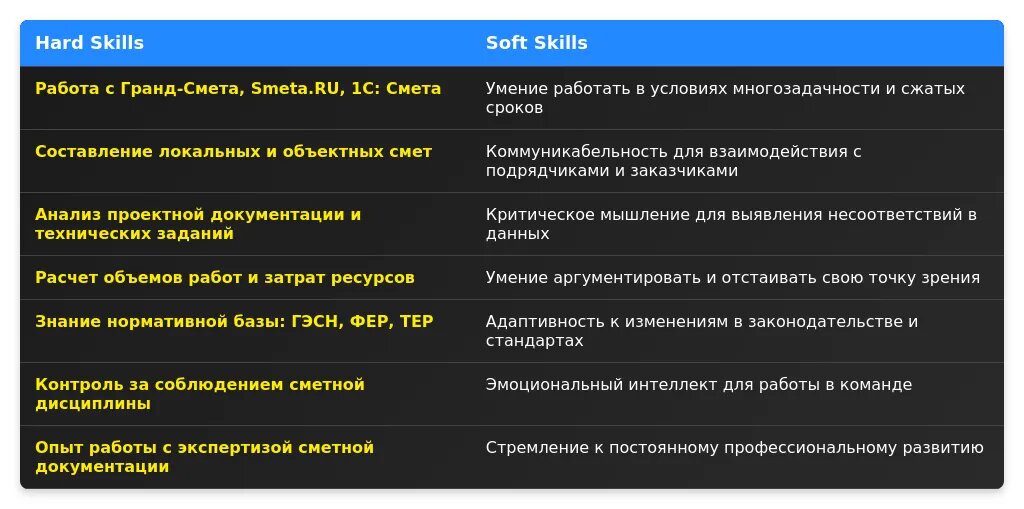 - Делайте акцент на навыках работы с программами (Гранд-Смета, 1С:Смета, Excel).