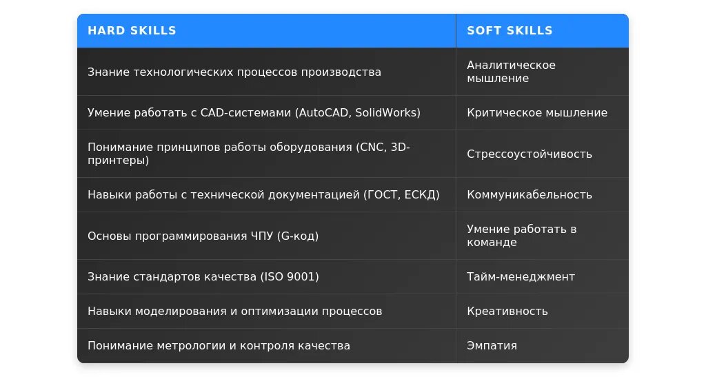 Анализ: Обязательные требования — базовые знания в машиностроении. Скрытое требование — высокая мотивация и обучаемость.