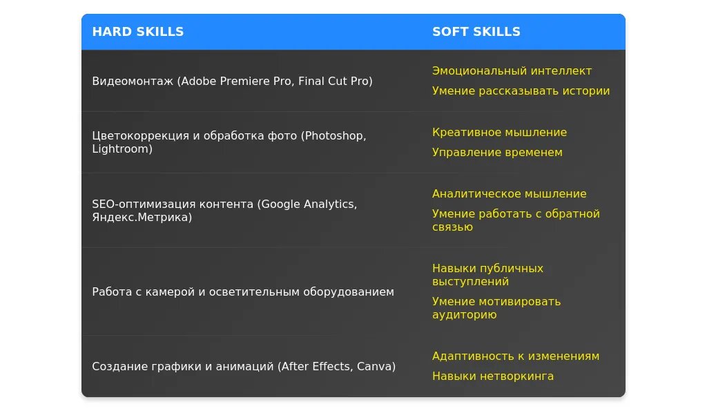 - Ключевые навыки (работа с аудиторией, создание контента, продвижение).