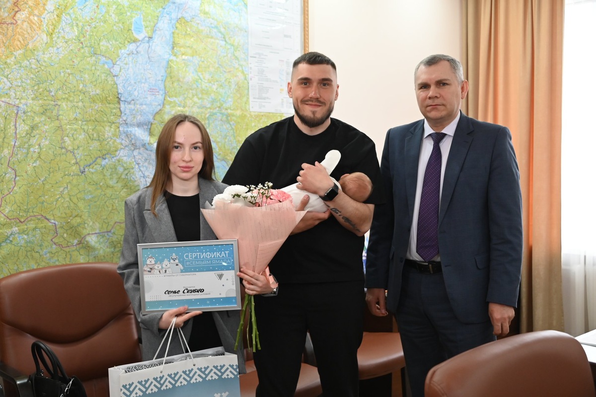 В торжественной обстановке 28 мая первый заместитель главы Шурышкарского района Андрей Глухих вручил молодой семье из Мужей – Владимиру, Ольге и маленькой Афине Скубко – сертификат на 3 миллиона рублей. Эта мера поддержки была введена по поручению губернатора ЯНАО Дмитрия Артюхова и начала действовать с 1 января 2025 года. Ранее для получения жилищного сертификата необходимо было, чтобы возраст супругов не превышал 35 лет. Учитывались также нуждаемость в улучшении жилищных условий и достаточный доход для покупки жилья. С января этого года добавлено новое условие: рождение ребёнка в 2025 году.