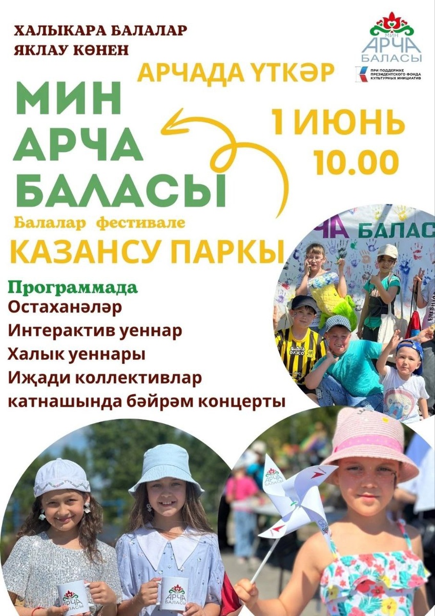 🌿Балаларны яклау көне уңаеннан Арча Укучылар сарае “Мин Арча баласы” исеме астында балалар фестивале үткәрә. 🎉Бүген, 1 июнь көнне 10 сәгатьтә балаларыгыз белән Казансу паркына килергә онытмагыз 💫Нәни кунакларны иҗади коллективлар катнашында бәйрәм концерты, кызыклы осталык класслары, төрле уеннар көтә