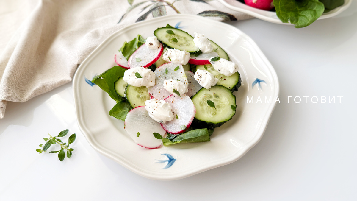 С наступлением лета так хочется чего-то лёгкого и витаминного. Сегодня я поделюсь с вами салатом, который является просто кладезью витаминов. Яркий и хрустящий – настоящая весна у вас на тарелке! Всем привет, мои дорогие! Этот салат готовится буквально за 10 минут, но в его ингредиентах просто невероятное количество витаминов и полезных веществ. Шпинат – это настоящий суперфуд! Он богат железом, витаминами А, С, фоливой кислотой, поддерживает кости и укрепляем иммунитет. Редис – содержит витамин С, калий, клетчатку, а так же добавляет салату пикантности. Огурцы – содержат очень мало калорий, освежают и увлажняют. Содержат минералы и витамины группы В и С. Сливочный сыр – полезен для костей, а так же придает салату нежность и сливочный оттенок. - 5 шт огурцов - 7 шт редиса - пучок шпината - 100 г сливочного сыра - черный молотый перец Заправка: - 40 мл подсолнечного или оливкового масла - 2 ч л сока лимона - свежий тимьян или сухие провансале травы - 1/2 ч л соли Огурцы, редис и шп