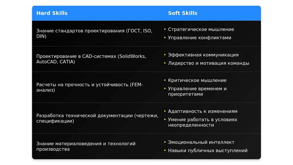 "Профессиональное владение AutoCAD и SolidWorks, опыт управления проектами и командой до 20 человек."