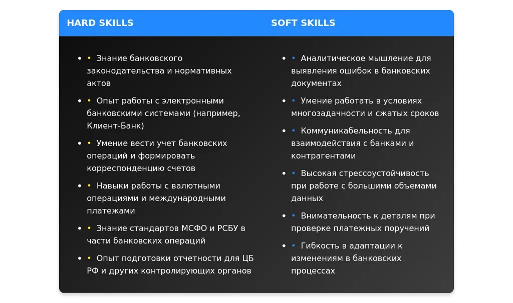 ✅ Организовал процесс ведения банковских операций, что сократило время обработки платежей на 20%.