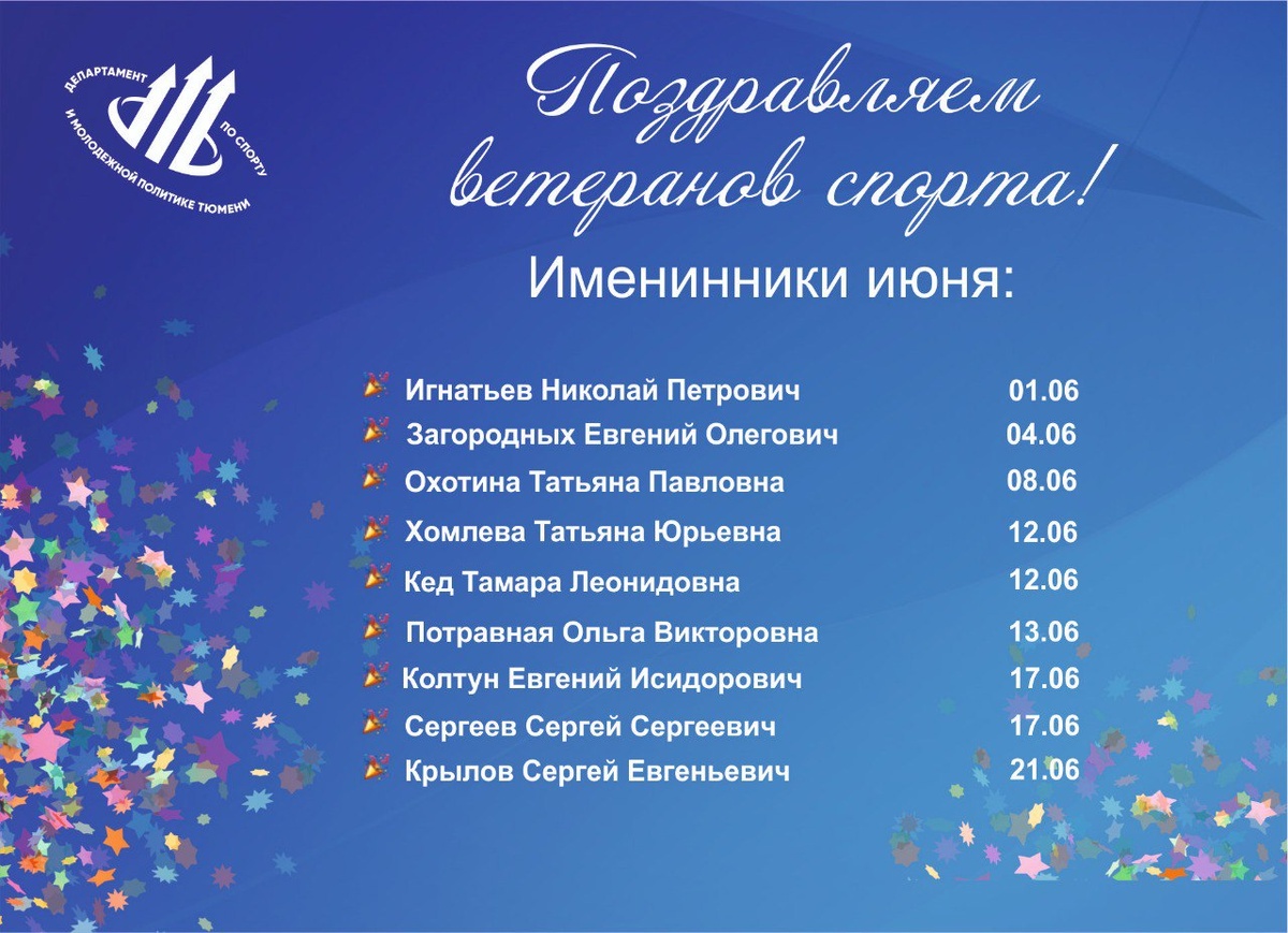 С днём рождения! От всей души поздравляем ветеранов спорта города Тюмени, отмечающих дни рождения в июне! Ваш многолетний труд, преданность спорту и личный пример служат вдохновением для молодого поколения. Благодаря вашему опыту и самоотдаче, тюменский спорт достиг значительных высот. Желаем крепкого здоровья, неиссякаемой энергии и благополучия. Пусть каждый день приносит радость и удовлетворение от любимых дел! #Ветераныспорта72