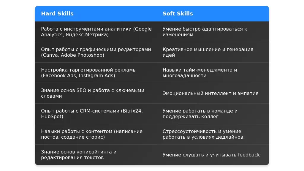 - Акцент на навыки: умение работать с инструментами, анализировать данные, создавать контент.