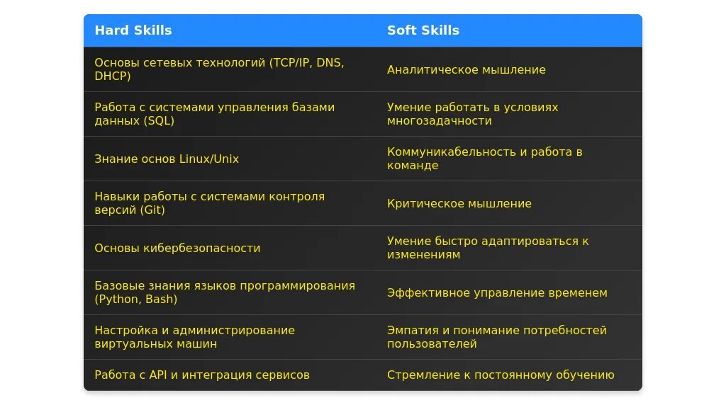 - Навыки для акцента: Основы программирования, работа с системами контроля версий, базовое администрирование.