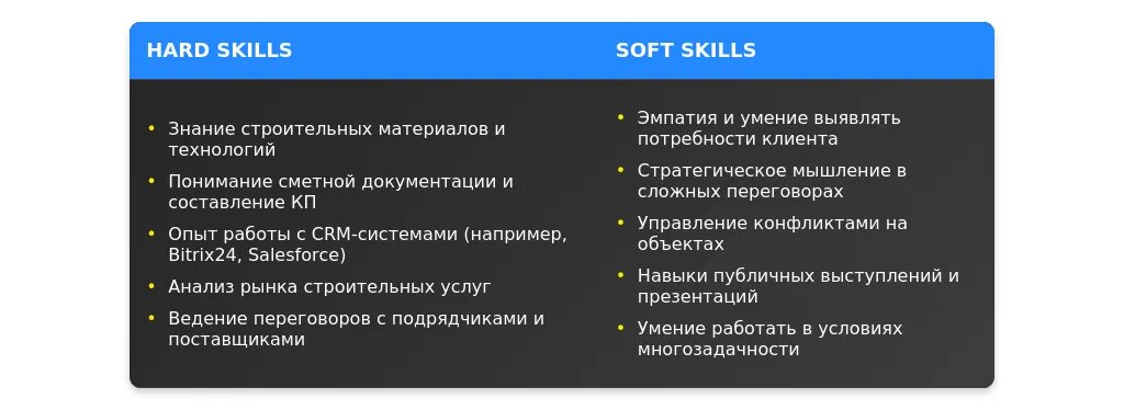 После адаптации: "Навыки: работа с CRM-системами (Bitrix24, Salesforce), ведение переговоров, анализ рынка строительных услуг".