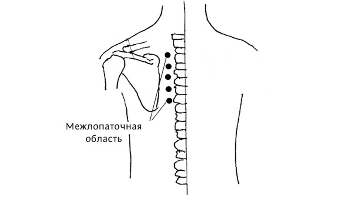 Межлопаточная область включает 5 основных точек, расположенных симметрично относительно позвоночного столба. Линия точек проходит посередине между позвоночником и краем лопатки. Самостоятельно добраться до них можно, если работать рукой противоположной половины туловища. Если же рука будет воздействовать на «своей» половине, возникнут чрезмерные напряжения, препятствующие надавливанию. Помните, что массаж выполняется на максимально расслабленных мышцах! Большой палец в данном случае задействовать трудно – надавливайте четырьмя пальцами. Если можно выполнить взаимомассаж, работаем следующим образом. Надо расположиться сзади массируемого и руки положить на надлопаточную область по обе стороны от шеи. Четыре пальца оказываются на ключицах и играют роль опоры, а для больших пальцев станут доступны верхние точки межлопаточной зоны (по мере работы ладони опускаются ниже). Точки обрабатываются попарно, хотя и разновременно: правый палец давит на правую точку, потом левый – на левую точку того